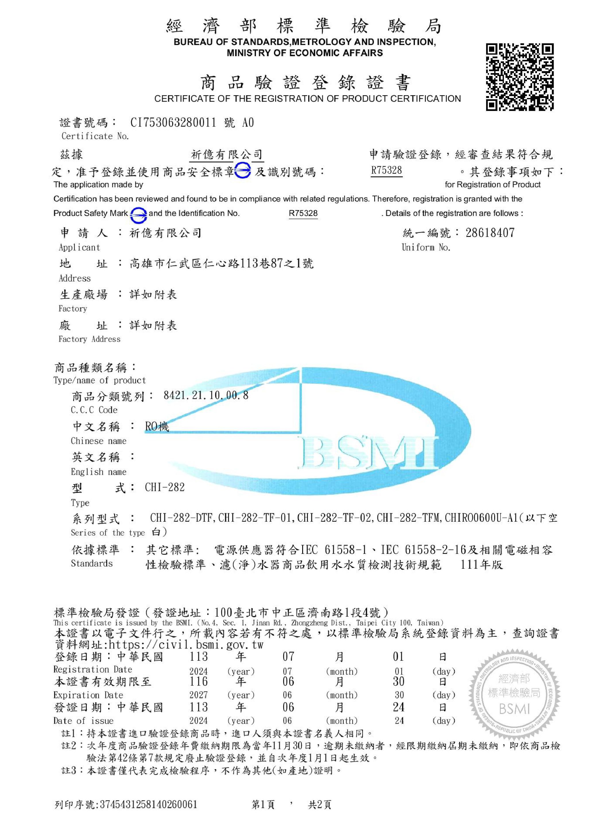 祈億有限公司(祈億淨水)已通過經濟部標檢局商品檢驗認證,BSMI識別編號R75328